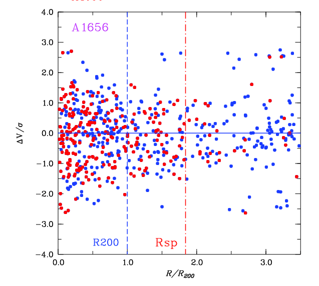 диаграмма (скорость–радиус) скопления A1656. Скорость представляет