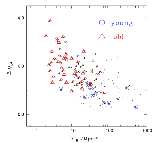 2.5, отделяет кандидаты в самые старые группы галактик типа «fossil».