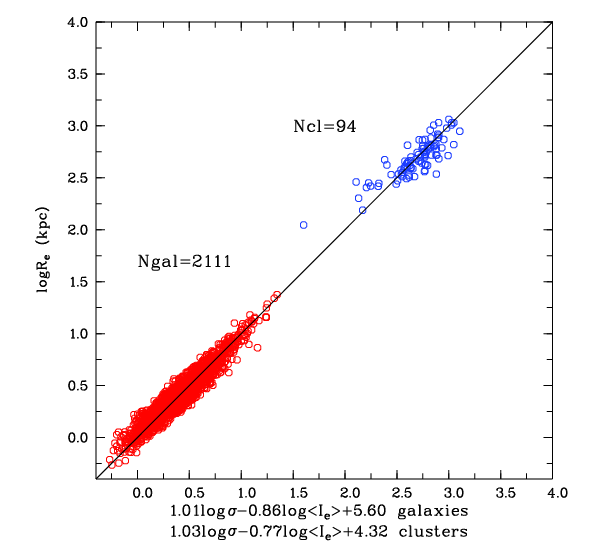 половину числа галактик и дисперсия лучевых скоростей систем галактик образуют Фундаментальную плоскость (ФП) LK = Re0.71×σ1.33. Нами также построена ФП в рентгеновской области, LX = Re1.26×σ2.70. Кроме того, нами получено, что форма ФП скоплений согласуется с формой ФП галактик ранних типов в фильтре r (SDSS).