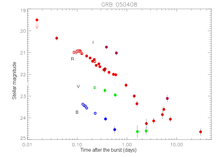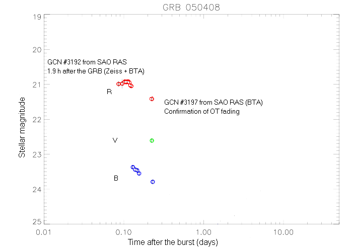 GRB 050408On April 8, 2005, an optical afterglow of the GRB 050408 was discovered with the SAO's telescopes (the 1-meter telescope Zeiss and 6-meter telescope BTA) within the framework of a joint BTA request (SAO RAS + IAA CSIC, Granada, Spain) on optical identification of gamma-ray bursts. We first detected a variable object only by our own data in the localization error-box reported by the space observatory HETE and then it was confirmed by our observations in SAO. (On the territory of the Commonwealth of Independent States nobody managed to do that yet...) Then multiband observations of this variable object were continued by a collaboration of 10 telescopes: SAO RAS, Spain, Denmark, England, India, Taiwan, Japan. As a result, on the 6-th day an unusual increase of the object brightness was detected. Its nature can be related to a dense envelope around a massive star-progenitor of SN/GRB. Allowing for a redshift z=1.2357, the observed nonmonotony (nonuniformity) of the light curve is analogous to that observed in optical afterglow of GRB 050708 on the second day after the GRB itself (the brightness increased 1.5 st.magn.) ![]() Figure 1. Only SAO's data (the 1-meter and 6-meter telescope). ![]() Figure 2. The total light curve of the optical object detected by data of the1-meter and 6-meter SAO telescopes. Open circles are for SAO's first RBV observations (published in GCN #3192 and GCN #3197). Filled circles are for BVRI observations by other members of an international collaboration of 10 telescopes with the use of SAO's data. The observational results were obtained under a joint porgram of Instituto de Astrofisica de Andalucia (Alberto J. Castro-Tirado, IAA-CSIC, Spain) and SAO RAS |