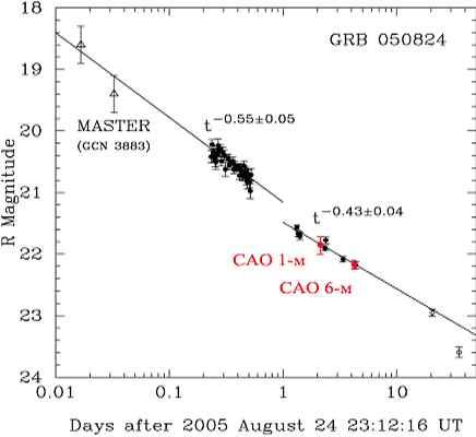 GRB 050824В рамках программы оптического отождествления гамма-всплесков (САО РАН + Instituto de Astrofisica de Andalucia (IAA), Granada, Spain) в августе (25.08 и 27.08) в САО проведены фотометрические наблюдения переменного оптического объекта (Оптического Транзиента) OT GRB 050824. Наблюдатель И.В.Соколов. Оптическое отождествление сделано в САО на ПЗС-фотометре 1-метрового телескопа по данным спутника-обсерватории SWIFT и с использованием оптических данных международного мониторинга гамма-всплесков. На 6-метровом телескопе объект (R~22) наблюдался 27.08 в двух фотометрических полосах (V и R). Наши данные подтверждают скачок на кривой блеска OT GRB 050824, который наблюдался примерно через сутки после всплеска. Готовится статья для A&A.