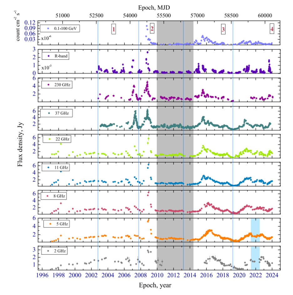 Было опубликовано исследование переменности блеска блазара AO0235+164 в широком спектральном диапазоне – от потока в γ-диапазоне до дециметровых радиоволн. Временной интервал наблюдательных данных, полученных в основном на российских радио и оптических телескопах – более 25 лет: с 1997 по 2024 год. На рисунке показаны кривые блеска блазара во всех исследованных диапазонах. Анализ показал наличие нескольких мощных вспышек блеска блазара во всем диапазоне, демонстрирующих нарастающую задержку – от γ-лучей до длинных радиоволн вплоть до 1.7 года. Уникальный 4-летний период: с 2009 по 2014 г показал также наличие соответствующей задержки блеска по диапазонам. По-видимому, свойства вспышечных процессов в ядре блазара мало отличаются как в моменты мощных вспышек, так и в периоде слабой активности. Это подтвердил статистический анализ совокупности всех кривых блеска. Поиск периодичности блеска во всех диапазонах дал указание на наличие квази-периодов в 6 лет и 2 года для общего временного ряда и для периода низкой активности, соответственно. Общий радиоспектр объекта хорошо описан двухкомпонентной моделью – низкочастотным стационарным излучением и синхротронным переменным радиоизлучением релятивистского джета. Помимо релятивистских электронов в этом джете могут присутствовать и протоны, что не противоречит наблюдательным данным.
