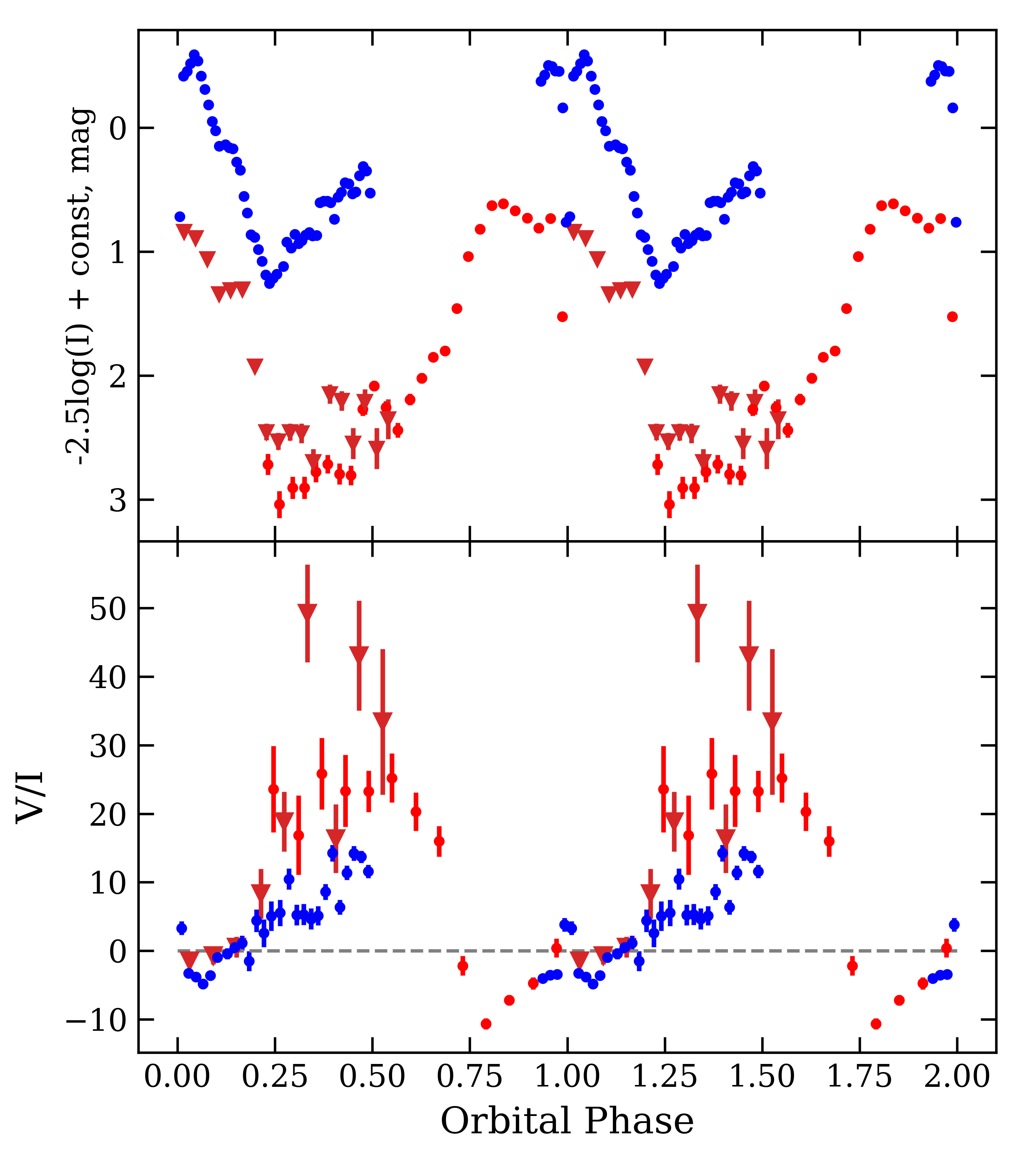 В работе выполнено комплексное исследование слабоизученного затменного поляра 1RXS J184542.4+483134 с коротким орбитальным периодом Porb = 79 мин. Анализ долговременных кривых блеска указывает на изменение положения и размеров аккреционного пятна при изменении темпа аккреции. В профилях эмиссионных линий выделяются узкая и широкая компоненты, которые, вероятно, образуются на баллистическом участке аккреционной струи и на магнитной траектории соответственно. Наблюдается инверсия профилей спектральных линий с эмиссионного на абсорбционный, обусловленная покрытием аккреционного пятна аккреционной струей. На основе продолжительности затмения и лучевых скоростей узкой компоненты линий наложены ограничения на массу белого карлика 0.49 ≤ M1/M⊙ ≤ 0.89 и наклонение орбитальной плоскости 79.7° ≤ i ≤ 84.3°. Анализ циклотронных спектров указывает на присутствие двух аккреционных пятен с напряжённостями магнитного поля B1 = 28.4 – 30.2 МГс и B2 = 30 – 36 МГс. При этом главное пятно имеет сложную структуру, которая, по-видимому, включает плотное ядро и менее плотную периферию, излучающую спектр с циклотронными гармониками. Поляризационные наблюдения демонстрируют смену знака круговой поляризации в течение орбитального периода и антикорреляцию степени поляризации с блеском поляра. Моделирование поляризационных наблюдений с использованием простой модели аккрецирующего белого карлика показывает, что поляризационные свойства могут быть интерпретированы в рамках двухполюсной аккреции с различающейся оптической толщиной аккреционных пятен (τ1/τ2 ~ 10). Анализ наблюдений Swift/XRT указывает на преобладание тормозного излучения в рентгеновском излучении системы.