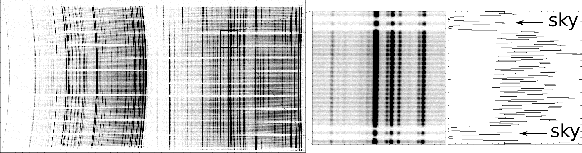 В дополнение к основным, в линзовом растре используются по 14 микрозрачков сверху и снизу, с помощью которых одновременно со спектром объекта формируется спектр от фона неба на удалении ±3' от центра изображения. Набор имеющихся в составе SCORPIO-2 объемных фазовых голографических решеток VPHG обеспечивает спектральный диапазон 4600-7300 A и разрешение λ/δλ от 1040 до 2800 в режиме IFU. Подробное описание блока IFU, методики наблюдений, получаемых данных и их обработки приведено в статье: