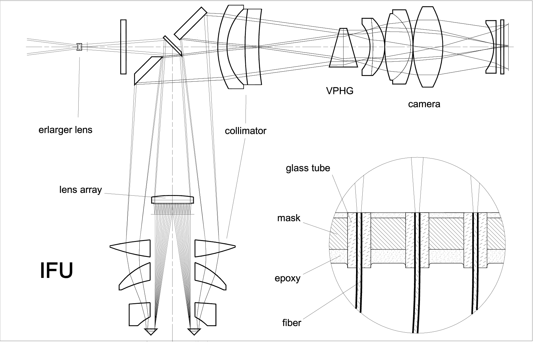 Оптическая схема IFU в SCORPIO-2В режиме IFU используется свой коллиматор (5-линзовый апохромат, F=240 мм, F/6), вводимый в оптический пучок вместо коллиматора, предназначенного для фокального редуктора. В линзовом растре используются оптические волокна, изготовленные по нашему заказу фирмой "НЦВО-Фотоника". С их помощью матрица микрозрачков реформатируется в две псевдощели, проектирующиеся коллиматором и камерой в плоскость светоприемника. Объемная фазовая голографическая решетка (VPHG) формирует на формате светоприемника два массива спектров. Рабочий участок спектра для каждой решетки выделяется полосовым интерференционным фильтром из набора SCORPIO-2, вводимым в пучок после линзы увеличения.