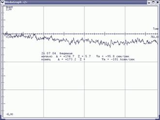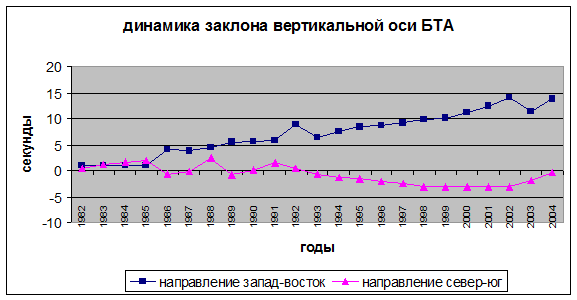 При проверке формул расчета А.М.Притыченко доказал их ошибочность и сделал необходимые исправления. Авторы методики согласились с исправлениями формул. По уточненным формулам произведен расчет наклона оси и оказалось, что, начиная с 1989 года, наклон оси превысил допустимые 5 секунд и прогрессирует. Это отражено на графике. К 2004 году наклон увеличился до15 секунд, что соответствует измерениям гидроуровня и теодолита.