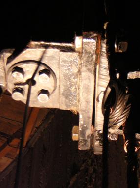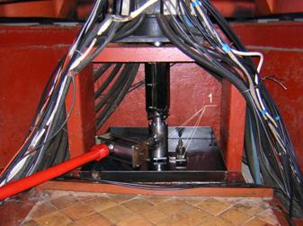 Во время проверки по звездам выявлено, что при А = +180о ±10о груз выборки мертвого хода не вращает телескоп, червяку приходится толкать телескоп, а не удерживать, когда он ведёт в минус. Обнаружено, что происходит трение троса о детали подвески из-за того, что неправильно выбрана точка крепления троса. Поэтому, при Ателескопа> =+160о , т.е. когда трос максимально намотан на цилиндр, а груз находится вверху, происходит его отклонение и трос пилит направляющую деталь подвески. Смотри (фото 6.)