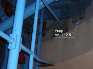 Происходило касание опорно-поворотной части к страховочному упору. Принято решение снять стружку по 1мм на двух деревянных страховочных упорах А = -157.5о и А= -112.5о (азимут указан в привязке к азимуту телескопа). Упор А = -67.5о строгали ЛОМО, но за время эксплуатации телескопа упоры не строгали. (Фото 5.)