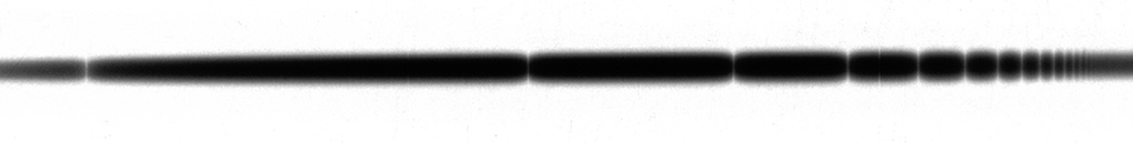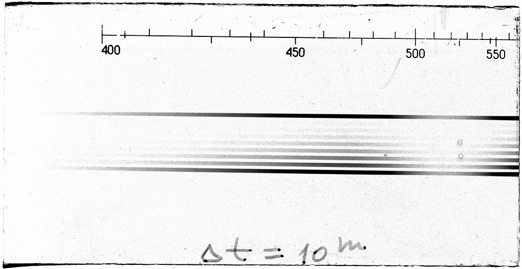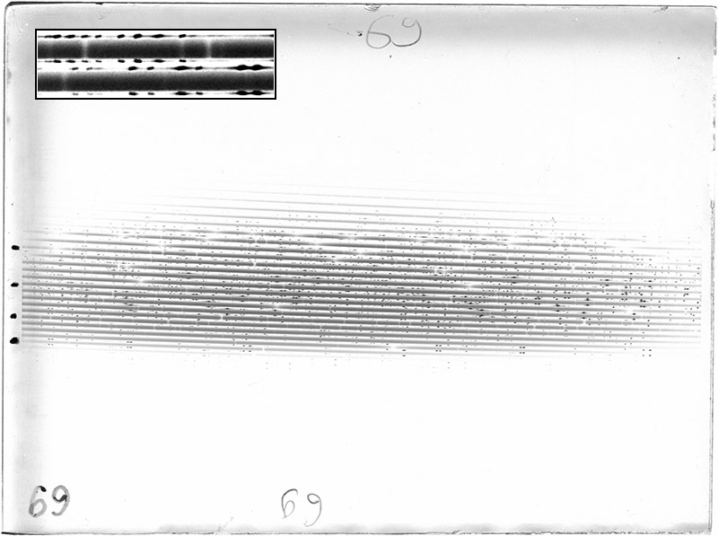 Данный массив из 726 спектрограмм является предметом сканирования. На рис.1 приведены образы фотоспластинок со спектрами пекулярных звезд HD23387 и HD20135, полученными со II-ой камерой ОЗСП. На рис.2a приведен образ фотопластинки со спектром стандартной звезды alpha Lyr, полученным со II-ой камерой ОЗСП. На рис.2b дан увеличенный фрагмент этого же спектра. Рис.3 представляет образ фотопластинки с зарегистрированной калибровкой интенсивности, полученной с помощью 9-ступенчатого ослабителя.
