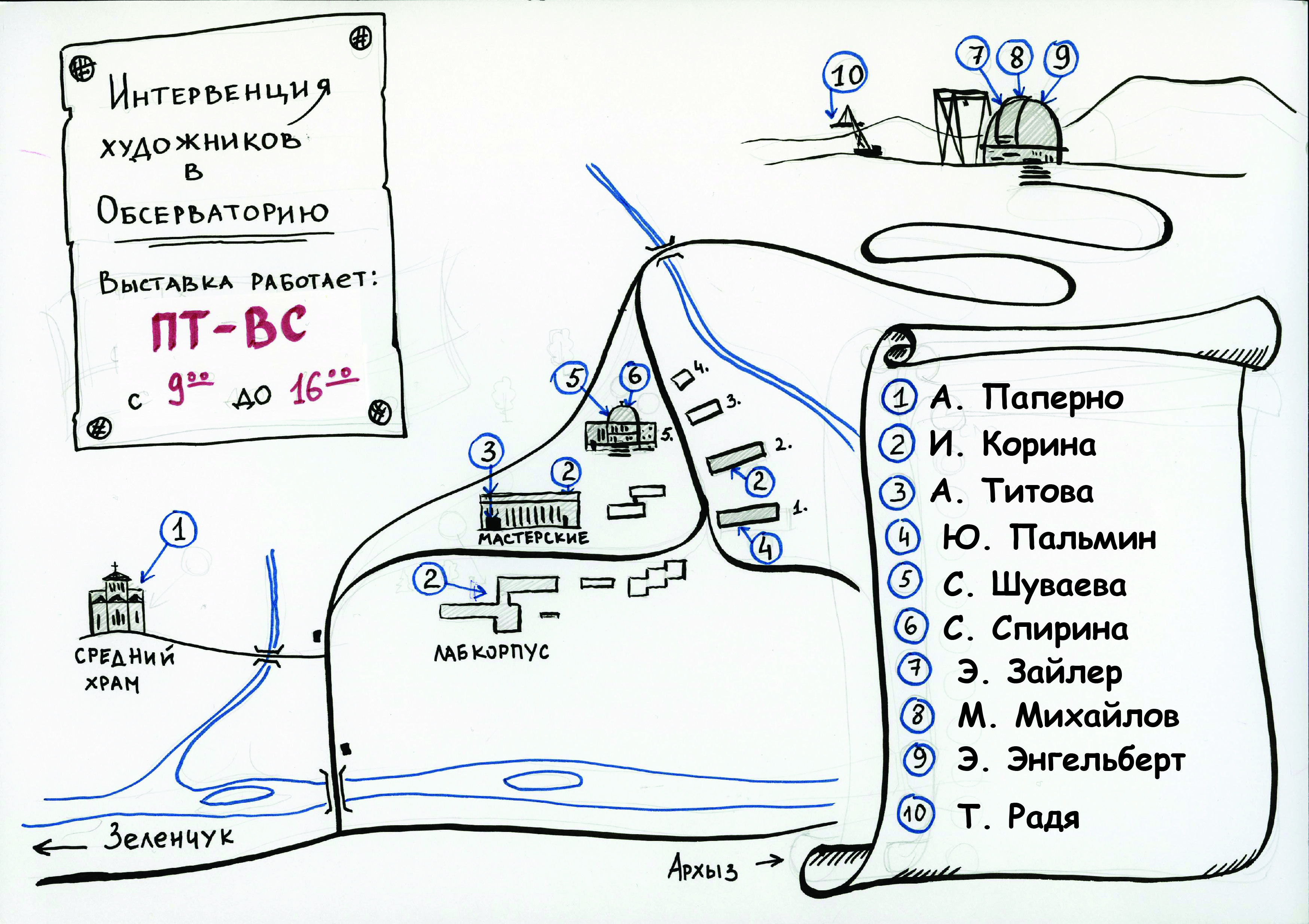 On the territory of SAO and its surroundings, an exhibition of works by contemporary artists is taking place. The items of art can be seen: in the Middle Church of the historical and architectural complex of Nizhny Arkhyz, in front of the laboratory building, in engineering workshops, on the wall outside of this building, in the post office, in the former shop in house 1, on the ground and first floors of house 5, and in the excursion gallery of the BTA. For the residents of the village, the exhibition is open all days of the week till November 5 from 8:00 to 17:30 (except for the post office which is closed on Sunday and Monday). Guests can explore the exhibition on the excursion days - on Friday, Saturday, and Sunday (except for the exhibit item located in the post office) from 9:00 to 16:00.