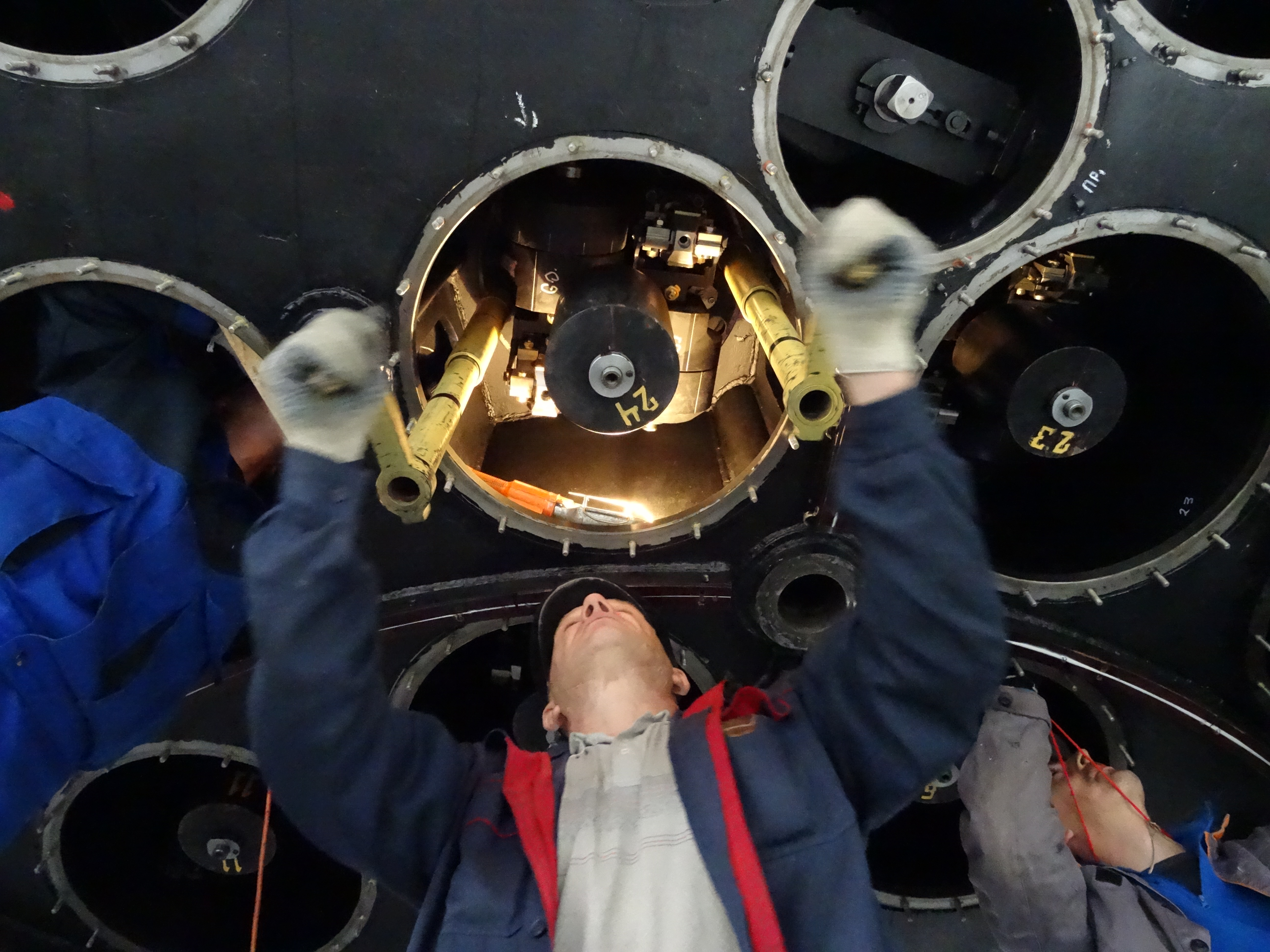 The next stage of the work involves adjusting the supports of the mirror to a new weight (as a result of the mirror repolishing, it became lighter by 800 kilograms) and installing them in the specialized holes at the bottom of the mirror. The adjustment of supports is a very difficult task - it takes a whole working day to adjust three pieces, and there are sixty of them. The supporting mechanism is designed to support a part of weight of the primary mirror (1/60 of weight or about 700 kg). Each mechanism combines the axial and radial supports which transmit load to the mirror varying depending on the position of the telescope tube. Installation of supports is planned to be completed in the second half of June.
