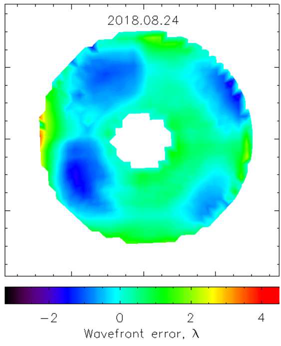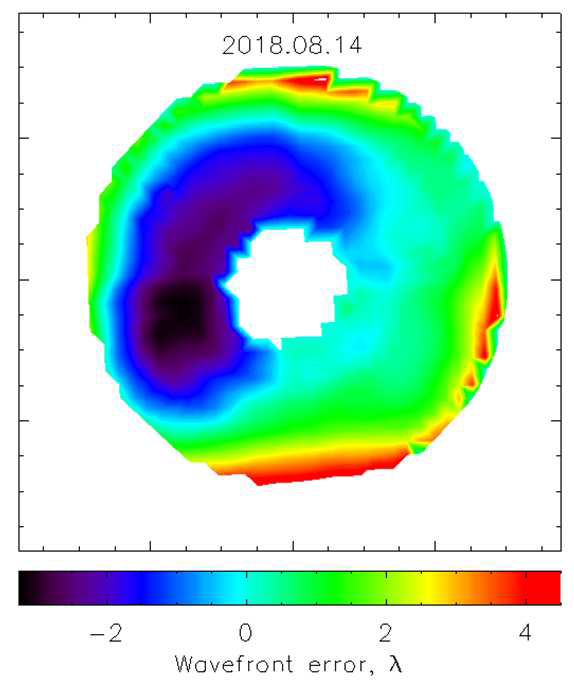 Thus, the observatory has now successfully completed all the necessary procedures for installing the refurbished mirror and measuring the characteristics of its surface. At the same time, we have to state that the quality of the surface is unsatisfactory. The main reason for this is a considerable inhomogeneity of the glass of the mirror blank, which led to unaccounted effects in the so called "band control" during mirror repolishing, when the form of the surface was controlled with the mirror being supported by a special band, without a support cell, and all the related deformations were to be calculated and took into account for further operations. As a result of the inhomogeneity, significant deviations of the surface from the paraboloid appeared after installation in the standard support cell.