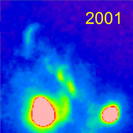 by about 14 deg and becomes much brighter and appears complex knotty