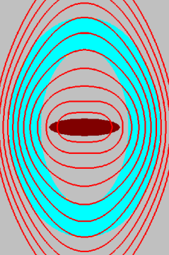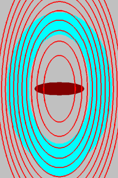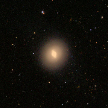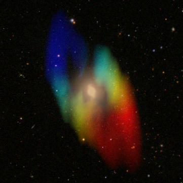 Fig.1. The SPRC-7 galaxy. Left: a combination of images in the g, r, i filters from the SDSS. The polar ring, surrounding the central lenticular galaxy is distinguished by its blue color due to the significant contribution of young stars. Middle: the SDSS image is combined with the velocity field of ionized hydrogen from the observational data of the 6-m BTA telescope: the colors correspond to the observed radial velocities (the blue dots are approaching us, the red ones are moving away from the observer), the intensity is scaled in accordance with the brightness distribution in the H-beta emission line. Right: the distribution of the gravitational potential of the dark halo according to the numerical calculations. The central disk and the polar ring are shown schematically.