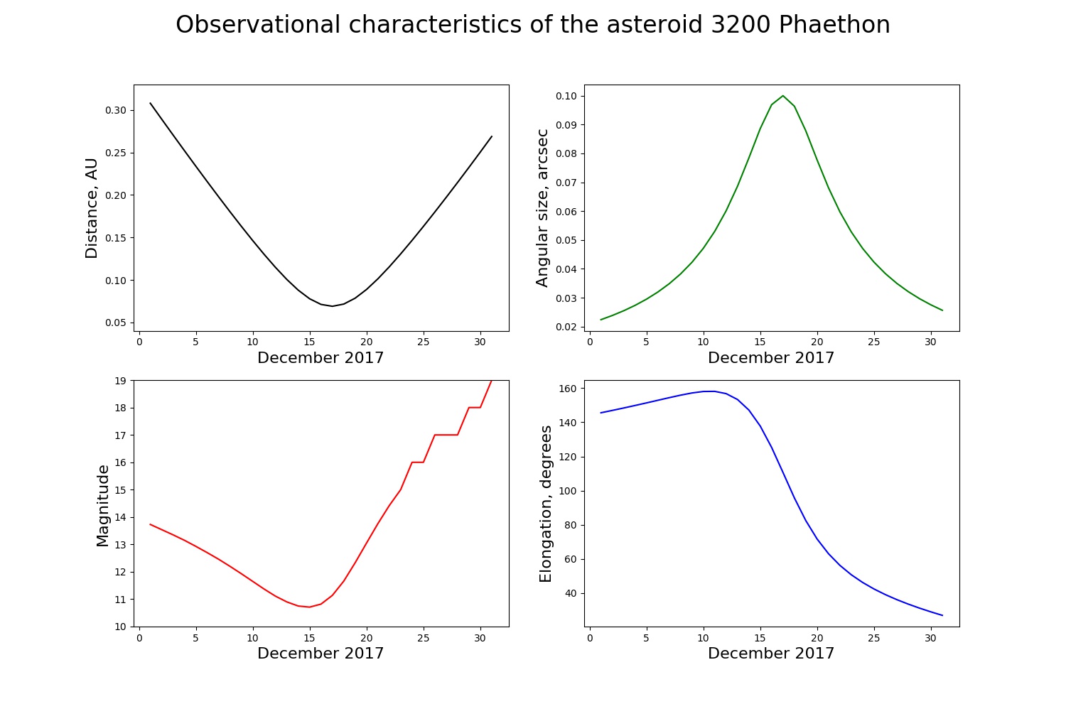 brightness (bottom left), and the Sun-Observer-Phaethon angle