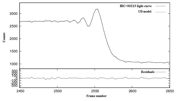 Fig.1. Coverage curve of IRC+00213 and the best-fit model of the uniformly bright disk. |