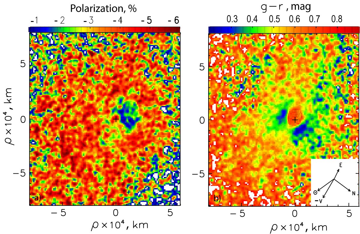 Fig.2. Distribution of the linear polarization in the r-SDSS filter (on the left) and color (g - r) (on the right) along the cometary coma of C/2011KP36 (Spacewatch) according to observations on November 25, 2016.