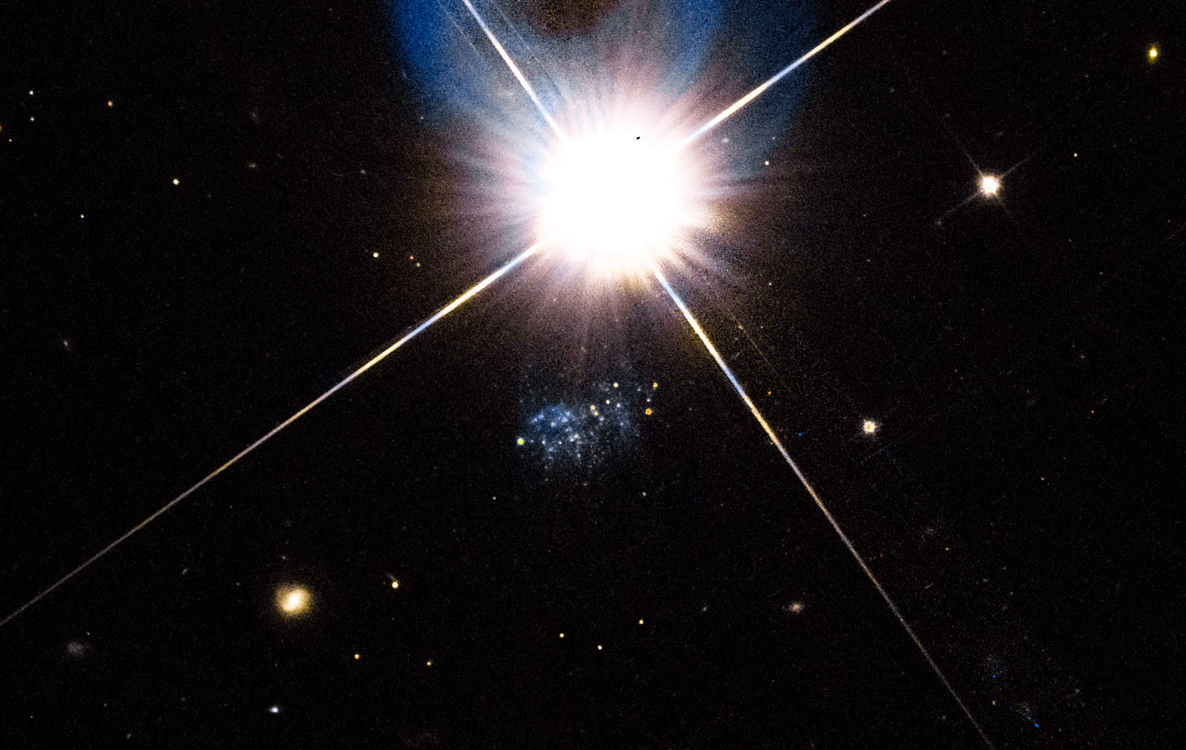 Fig.1. Two-color image of the dwarf galaxy HIPASS J1131-31 obtained with the Hubble Space Telescope in the F606W (blue) and F814W (red) filters. The image size is 70×45 arcseconds, North is at the top.
