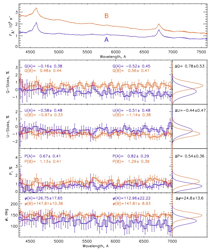 Gravitational lenses, known for forming multiple images of distant objects (galaxies and quasars), are often used in modern astrophysics to diagnose the large-scale distribution of matter in the universe. However, the study of the lensed images themselves allows us to examine in more detail the structure of the central parsec of active nuclei, spatially unresolved using direct optical methods. Object Q0957+561 is the first discovered gravitationally lensed quasar at redshift z=1.4. A type 1 quasar is lensed by an elliptical galaxy (z=0.36), so two images of a quasar separated by 6" are observed on the celestial plane. During observations of the lensed quasar Q0957+561 on the BTA, it was first discovered that the polarization vector is oriented differently in two images of the source, and the polarization angle varies with the wavelength. Previously, similar properties have not been found in gravitationally lensed objects. Two most preferable scenarios are proposed to describe the effect: 1) due to the radiation delay between the quasar images of about 400 days, different states of polarization can be observed due to the precession of the disk-jet system; 2) a complex lensing effect is observed: due to the different aiming distance of the component relative to the lens, images can be amplified differently, e.g., in a closer component, the polarized radiation of the accretion disk can be amplified due to microlensing, which is why the polarization of the component differs. The work was supported by the RNF grant No. 20-12-00030 "Investigation of the geometry and kinematics of ionized gas in the nuclei of active galaxies by polarimetry methods". Authors: V.L. Afanasiev, E.S. Shablovinskaya (SAO RAS), together with L. Popovic and D. Savic (Astronomical Observatory of Belgrade, Serbia)