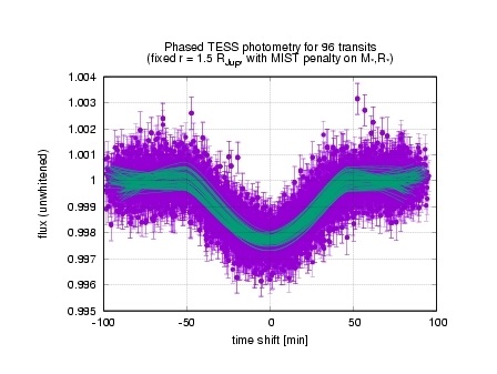 The photometric data from the TESS orbital telescope, an average curve is drawn through each of the 96 observed transits.