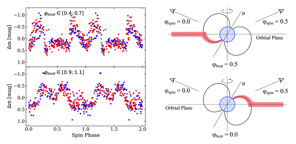 Kolbin A.I., Suslikov M.V., Kochkina V.Yu., Borisov N.V., Burenkov A.N., Oparin D.V. (SAO RAS) Polars are close binaries consisting of an accreting magnetic white dwarf (hereinafter referred to as a WD) and a cool donor star (usually an M dwarf). The strong magnetic field of a WD (10-100 MG) makes these systems synchronous, i.e., leads to equality of the WD rotation period Pspin and the orbital period Porb. However, among the polars, there is a small group of asynchronous polars (8 systems with candidates are known) exhibiting asynchrony <3%. The nature of the asynchrony remains unclear, but it has been suggested that it may be due to the recent Nova explosion. Our work has supplemented the list of asynchronous polars with the system SDSS J085414.02+390537.3. We discovered its asynchrony from the analysis of ZTF photometry, in which different periods Porb and Pspin are distinguished as well as the beat period Pbeat (1/Pbeat = 1/Porb - 1/Pspin). The corresponding polar asynchrony is 0.3%. The system shows signs of a change in the main accreting pole, which are difficult to detect in previously known systems. The spectra of the polar obtained at the BTA telescope with the SCORPIO-1 and -2 instruments demonstrate Zeeman splitting of hydrogen lines and cyclotron harmonics, the modeling of which gives an estimate of the WD magnetic field B = 28-34 MG. The work was supported by the grant of the Russian Science Foundation № 22-72-10064.
