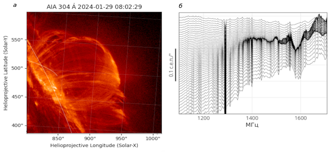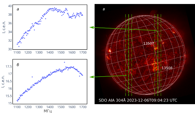 The solar corona, the outer layer of the Sun atmosphere, is a unique object for studying high-energy processes. Its temperature in a quiet state reaches 1–2106 K which is significantly higher than that of the photosphere (about 5500 K), this is a paradox and one of the main mysteries of solar physics. The corona extends for millions of kilometers forming structures such as magnetic field loops, coronal holes (sources of high-speed solar wind), and plasma ejections that directly affect the Earth’s space weather. Studying the corona is the key to solving many issues including an unexplained heating anomaly and the mechanism of solar flares. It can only be observed during a total solar eclipse or with the help of coronagraphs that hide the bright disk of the Sun. Modern missions such as Parker Solar Probe and Solar Orbiter have made it possible to come closer to unraveling the mechanisms of corona heating and its dynamics. However, key questions, including the nature of narrow-band absorption effects, remain open. Using a new high-speed spectral complex at the RATAN-600 radio telescope (an effective area of ≈ 1500 m² at 1.5 GHz) in the range of 1–3 GHz, previously inaccessible phenomena were discovered. In particular, strong absorption of radio waves over active regions with clear frequency boundaries in the decimeter range was detected. This discovery was made possible by a combination of high spectral resolution (up to 10-5) and interference suppression methods, which allowed us to isolate weak signals (up to 10-3 s.f.u.) against the background of powerful radiation from the quiet Sun (50–100 s.f.u.) with a dynamic range of up to 90 dB. In this work, absorption in many fine structures in the coronal plasma was detected using a spectral complex with a relative frequency resolution of 10-5 and a time resolution of 8 ms in the range of 1–3 GHz, in the radio emission spectra of individual active regions (ARs), prominences, and filaments. Similar structures in the form of “coronal rain” (Fig. 1, top) are studied in optics in the X-ray and EUV lines at large telescopes with diameters of 1.6 m and 4.0 m, but were detected for the first time in the spectra of the corona at radio waves (Fig. 1b). For comparison, Fig. 2 shows the spectra of the quiet Sun and the active regions of NOAA 13507(8). The dotted lines show the positions of the beam pattern at RATAN-600 at the moments of obtaining the spectra, and the dash-dotted lines show the width of the radiation pattern at a wavelength of 20 cm. The presented results offer great opportunities for further studies of the fine structure of the corona using the radio range. Combined data analysis allows us to obtain a more complete picture of the physical processes occurring in the solar corona and to come closer to understanding the mechanisms of its heating when measuring the temperature balance.