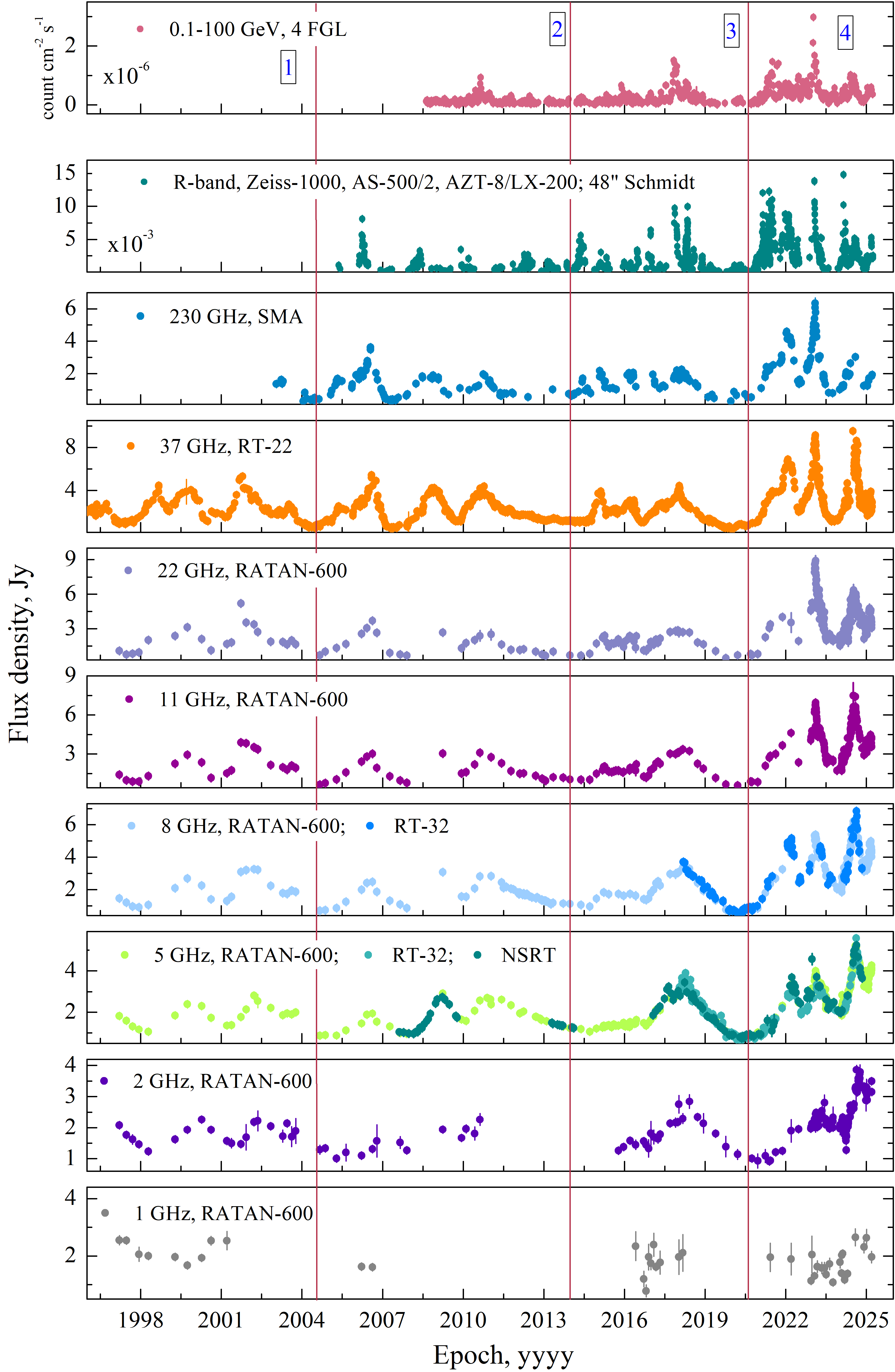 Multiband light curves of Ton 599 in 1997-2025.