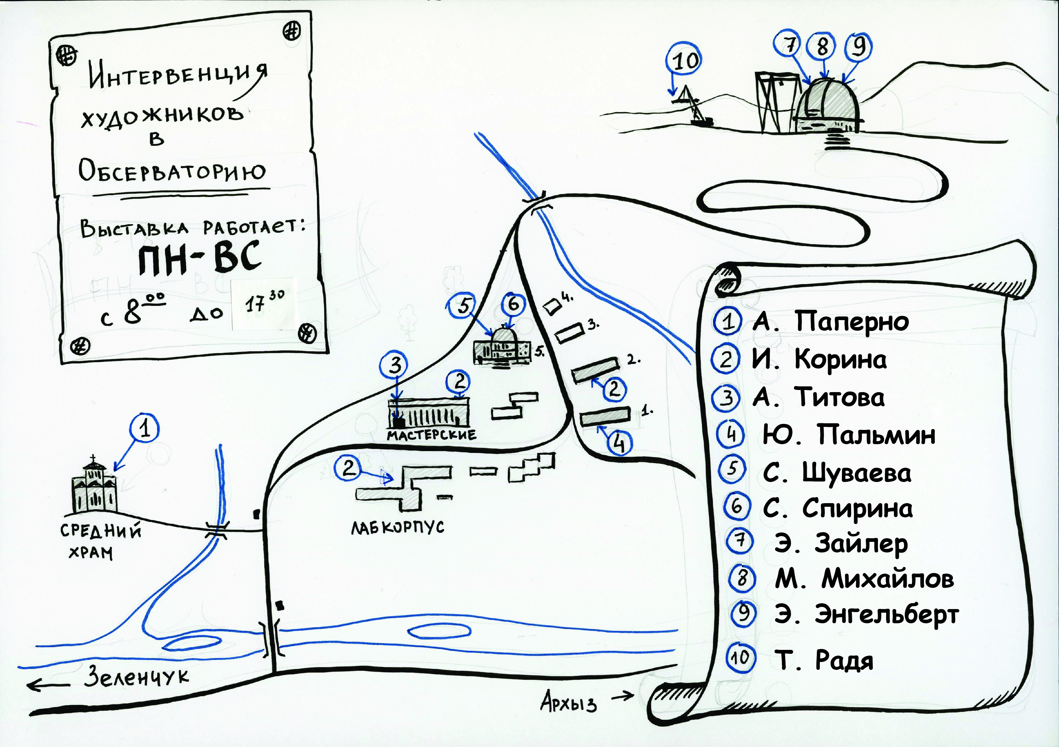 На территории САО и ее окрестностей проходит выставка работ современных художников. Экспонаты можно увидеть в Среднем храме Нижнеархызского историко-архитектурного комплекса, на площадке перед Лабораторным корпусом, в механических мастерских, на стене здания мех. мастерских, в помещении почты, в старом магазине в первом доме, на первом и втором этажах пятого дома и в экскурсионной галерее БТА. Для жителей поселка выставка открыта все дни недели до 5 ноября с.г. с 8:00 до 17:30 (кроме почты, которая не работает в воскресенье и понедельник). Гости обсерватории могут осмотреть выставку в дни проведения экскурсий - в пятницу, субботу и воскресенье (кроме экспоната, расположенного в помещении почты) с 9:00 до 16:00.