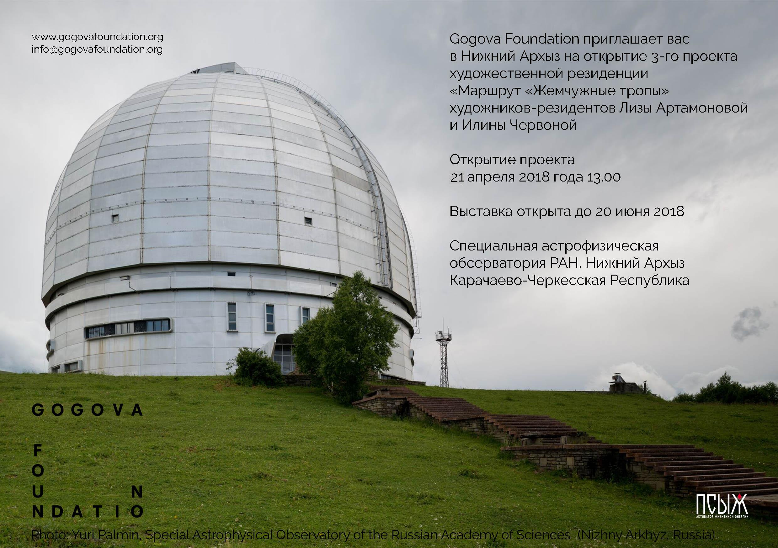 21 апреля 2018 года в Специальной астрофизической обсерватории РАН в Карачаево-Черкесской Республике будет представлен персональный проект участниц третьей художественной резиденции Gogova Foundation Лизы Артамоновой и Илины Червонной - художниц из России.
