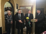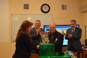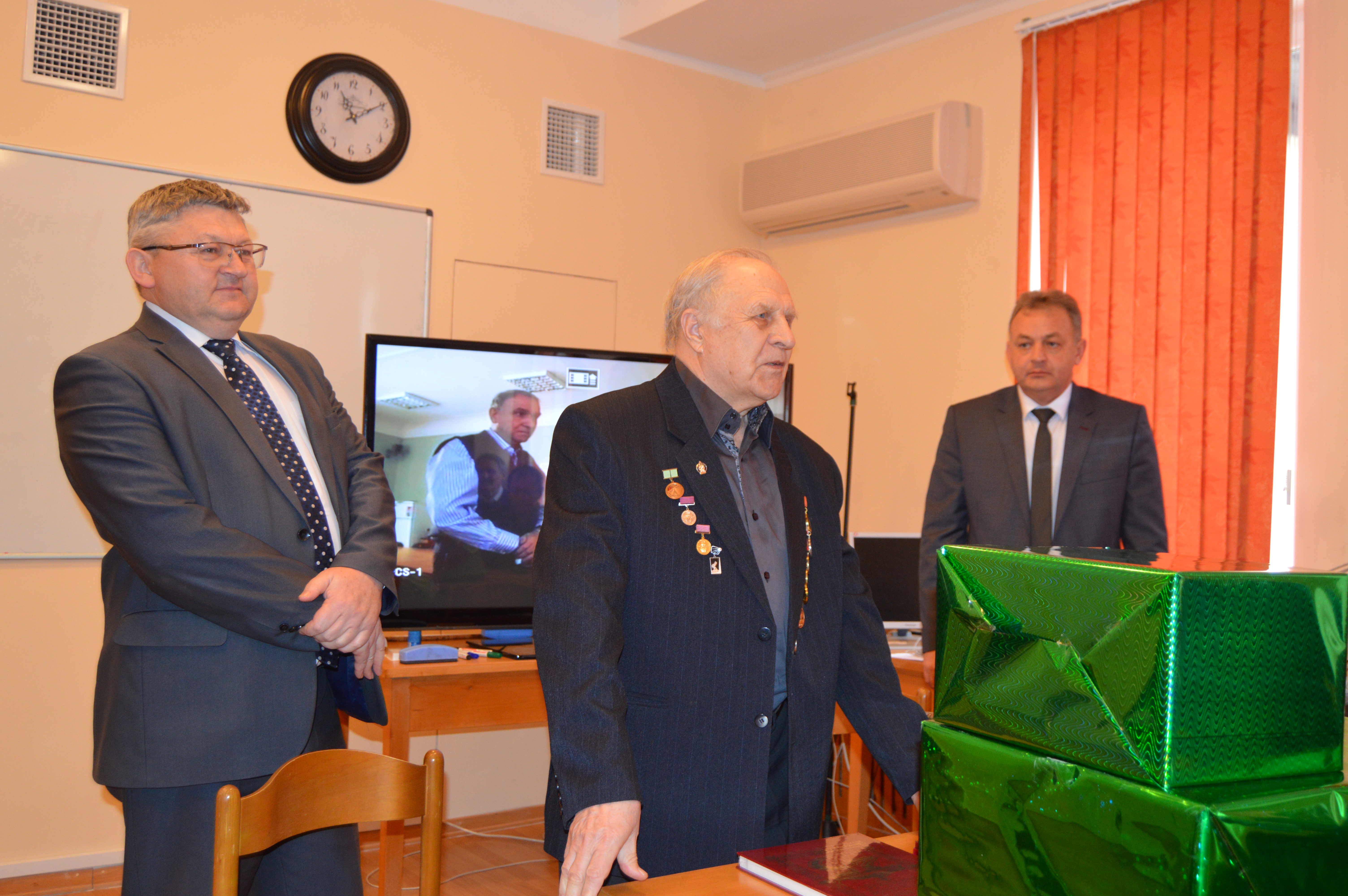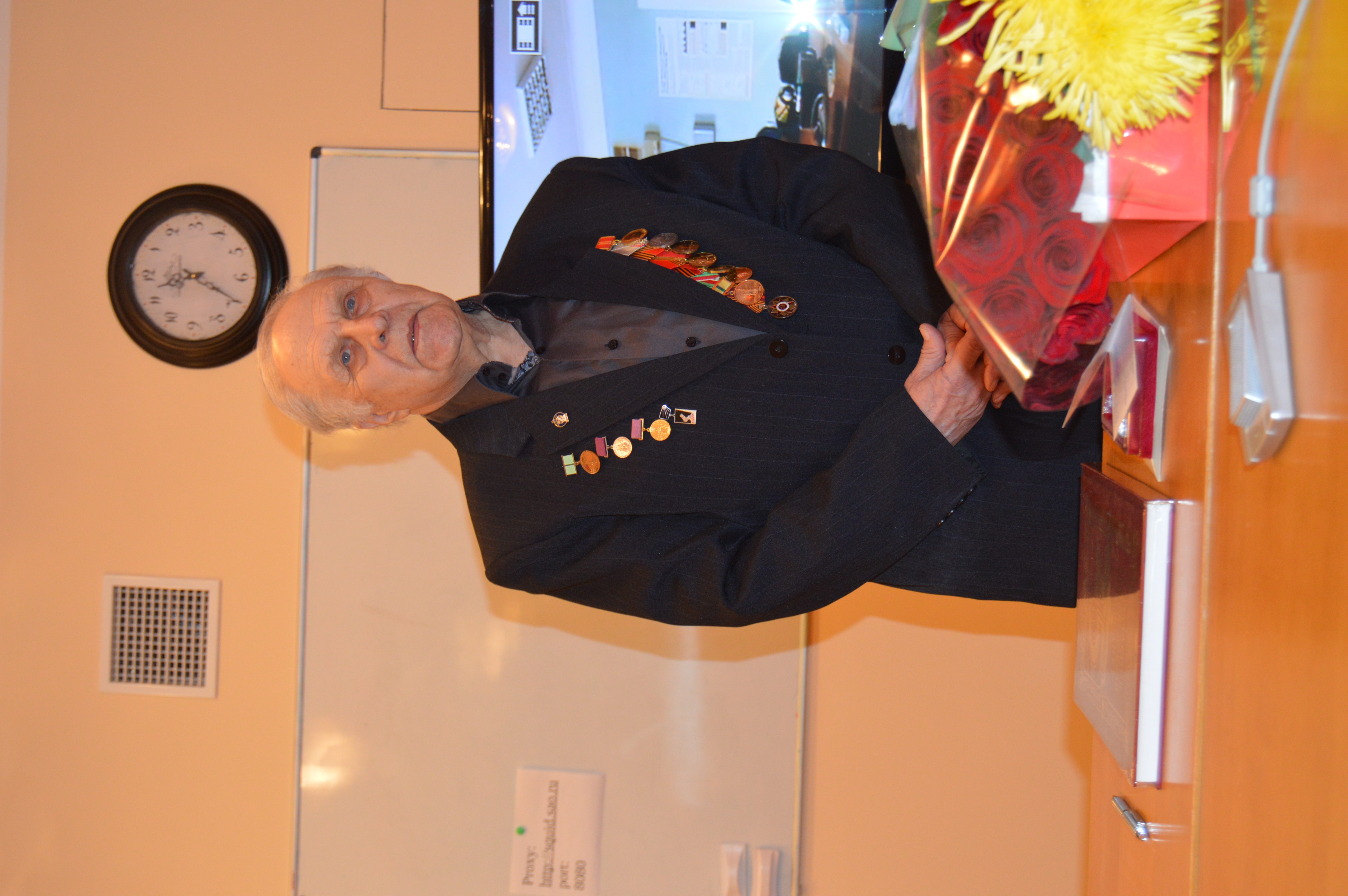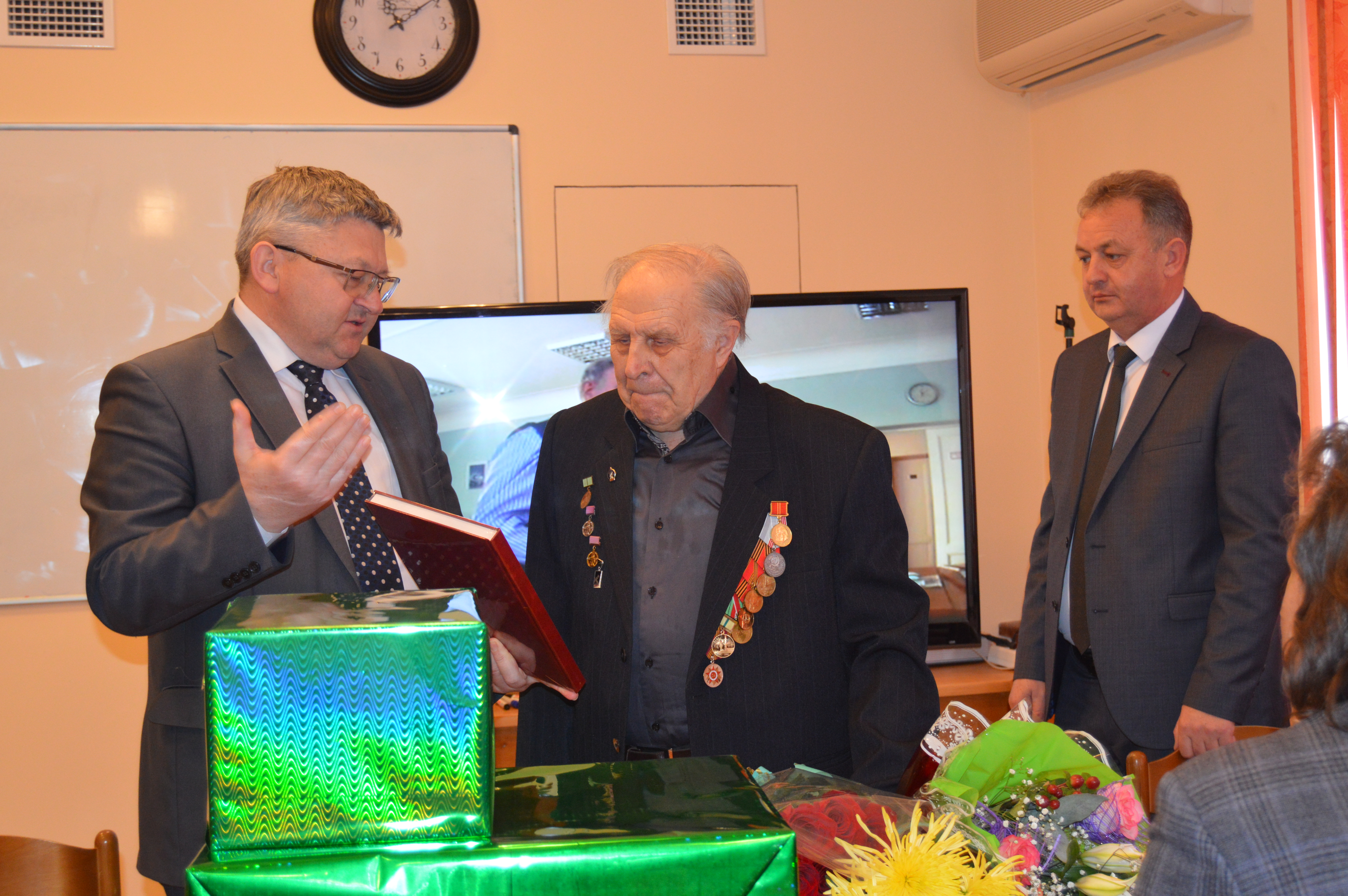 В торжественной обстановке Юрию Владимировичу были вручены памятный знак "В честь 75-летия полного освобождения Ленинграда от фашистской блокады", цветы и подарки.