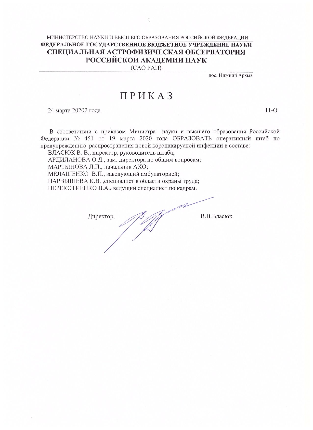 Приказ САО РАН «Об образовании оперативного штаба» от 24 марта 2020 года №11-О