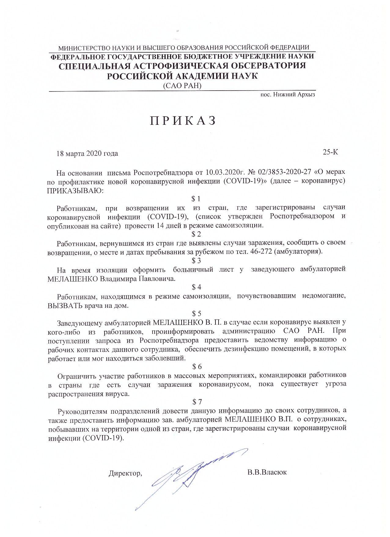 Приказ САО РАН «О мерах для работников по возвращении их из стран, где зарегистрированы случаи заражения коронавирусной инфекцией» от 18 марта 2020 года №25-К