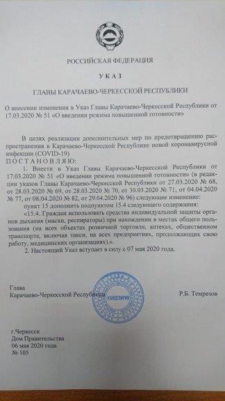 Указ Главы КЧР «О внесении изменений в Указ Главы КЧР от 17.03.2020 №51 «О введении режима повышенной готовности» от 6 мая 2020 года №105