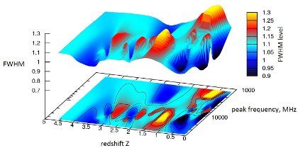 Отношение "красное смещение - пиковая частота - FWHM" для источников