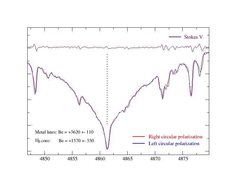 В результате наблюдений на 6м телескопе выборки из 23-х химически пекулярных звезд с сильными полями было обнаружено, что у 22-х из них магнитное поле измеренное по ядрам линий водорода, оказывается существенно (примерно на 1/3) меньше поля, найденного по линиям металлов, на одних и тех же спектрах. (На рис.1 и рис.2 в качестве примера приведена звезда с сильным полем 53 Cam).