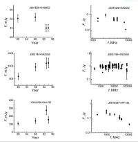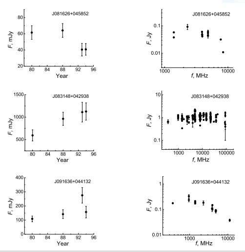 Для поиска радиоисточников со значительной переменностью потока был использован материал радиообзоров "Холод", проводившихся РАТАН-600 с 1980 по 1994 гг. Обнаружены 73 переменных радиоисточника со значительными флуктуациями плотности потока (рис.2), которые в соответствии с различными статистическими критериям являются переменными на масштабах в несколько лет. У 52 радиоисточников долговременная переменность зафиксирована впервые. Родительские объекты переменных радиоисточников относятся к активным галактикам. Для половины объектов это установлено по спектрам обзора SDSS, а для остальных, более слабых в оптике, - по классификации обзора SDSS или по показателям цвета в обзоре инфракрасного диапазона WISE.