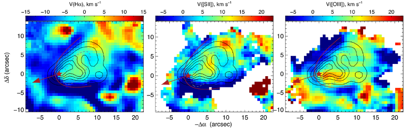Показаны поля лучевых скоростей в эмиссионных линиях ионизованного