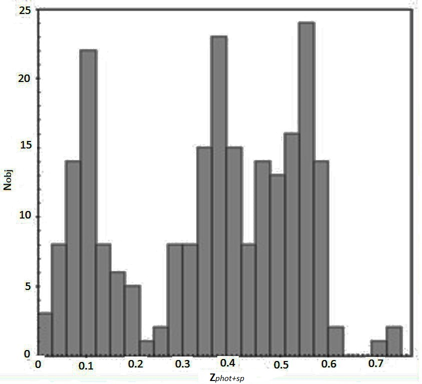1. Распределение фотометрических красных смещений (рис. 1) показывает пик