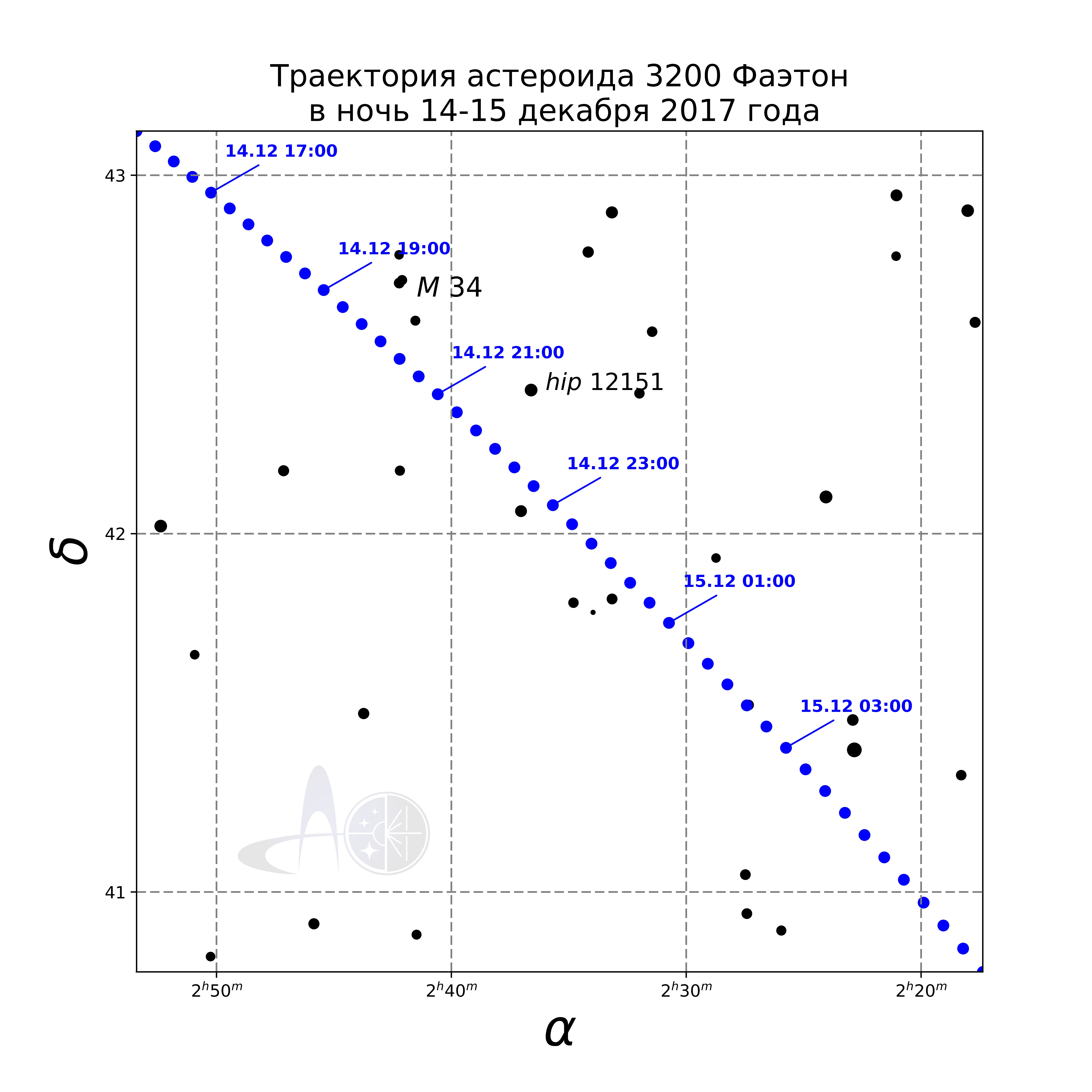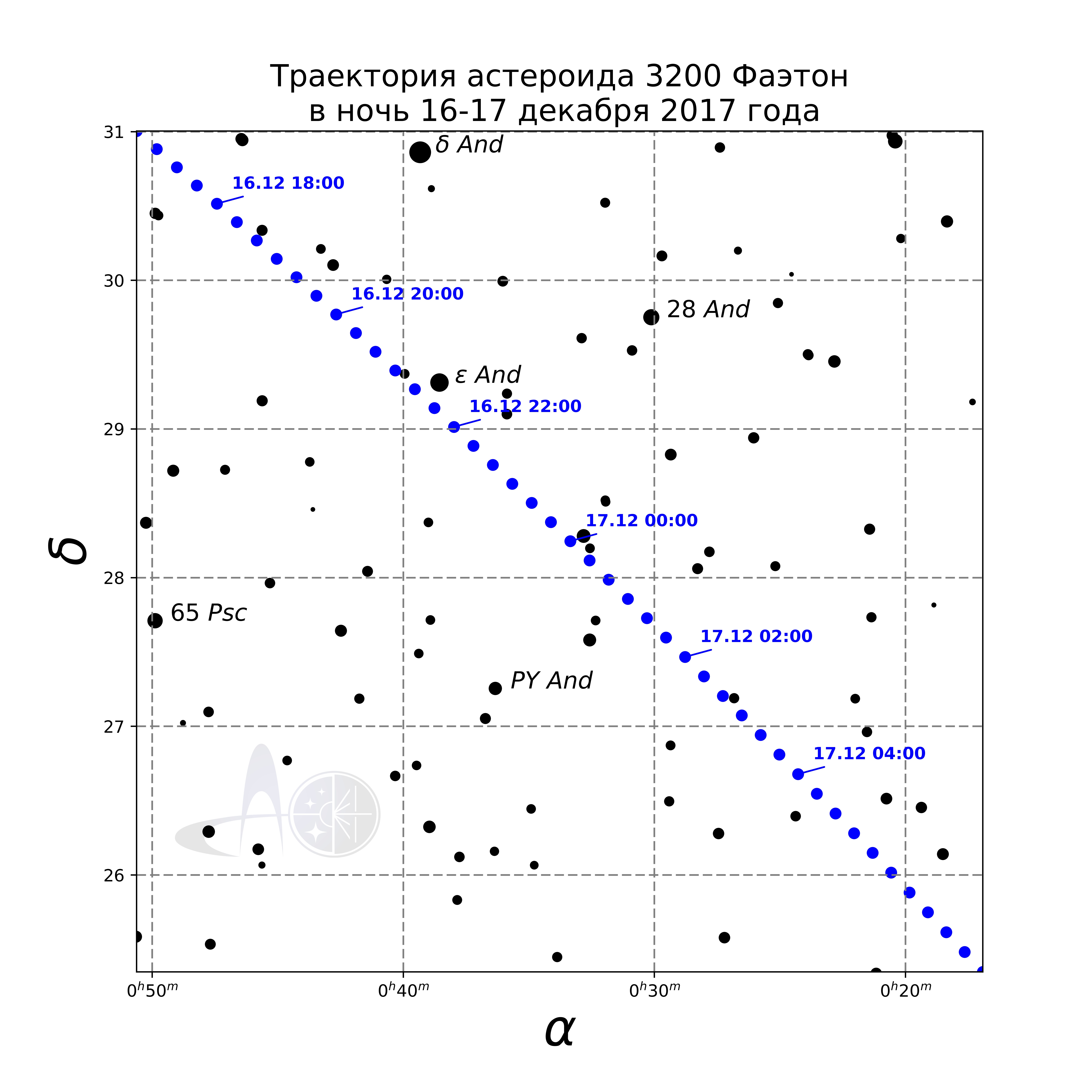 Траектория астероида Фаэтон в ночи с 14, 15 и 16 декабря 2017 года.