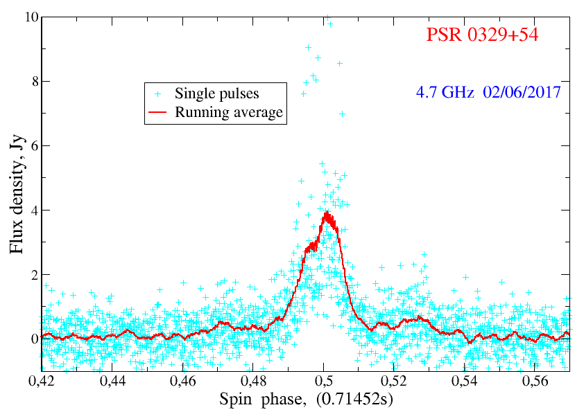 б УНДЕ ЯОЕЖХЮКЭМШУ ХГЛЕПЕМХИ АШКХ БОЕПБШЕ НАМЮПСФЕМШ НДХМНВМШЕ ХЛОСКЭЯШ НР АКХГЙНЦН ОСКЭЯЮПЮ PSR0329+54 МЮ чФМНЛ ЯЕЙРНПЕ Х ЛНКНДНЦН ОСКЭЯЮПЮ PSR0534+22 Б йПЮАНБХДМНИ РСЛЮММНЯРХ МЮ гЮОЮДМНЛ ЯЕЙРНПЕ ПЮДХНРЕКЕЯЙНОЮ пюрюм-600. б ОХКНРМНЛ НАГНПЕ АШЯРПШУ ПЮДХНБЯОКЕЯЙНБ МЮ гЮОЮДМНЛ ЯЕЙРНПЕ МЮ РПЕУКСВЕБНЛ 4-ЙЮМЮКЭМНЛ ЙНЛОКЕЙЯЕ Б ОНКНЯЕ ВЮЯРНР 4.2-4.8 ццЖ АШКХ НАМЮПСФЕМШ ОЪРЭ НДХМНВМШУ ЦХЦЮМРЯЙХУ ХЛОСКЭЯНБ (цх) НР 33-ЛХККХЯЕЙСМДМНЦН ОСКЭЯЮПЮ PSR0534+22 Б йПЮАНБХДМНИ РСЛЮММНЯРХ. 30 ХЧМЪ 2018 ЦНДЮ ОНРНЙ цх (~1 ЛЯ) ОПЕБШЯХК 150 ъМ, ОПХ РНЛ, ВРН ОНРНЙХ ЯПЕДМХУ ХЛОСКЭЯНБ КЕФЮР МХФЕ 10 ЛХККХЪМЯЙХУ. оН ЯДБХЦС БПЕЛЕМХ ОПХУНДЮ ХЛОСКЭЯНБ АШКЮ ХГЛЕПЕМЮ ЛЕПЮ ДХЯОЕПЯХХ: MD = 57+-1 ОЙ/ЯЛ^3 Б УНПНЬЕЛ ЯННРБЕРЯРБХХ Я ПЮМЕЕ ОПНБЕДЕММШЛХ ХГЛЕПЕМХЪЛХ.