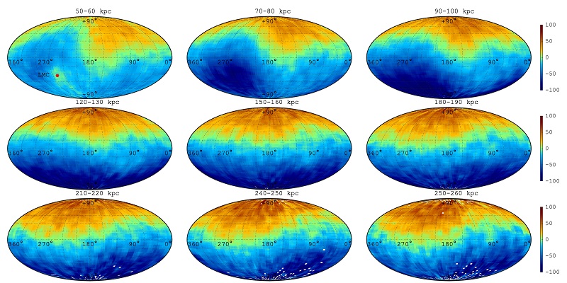 Карликовые галактики дают уникальную возможность для изучения эволюции Млечного Пути и Местной группы галактик в целом. Анализируя бегущий апекс Солнца на основе кинематики спутников Млечного Пути, мы обнаружили неожиданное поведение дипольного члена распределения лучевых скоростей в зависимости от галактоцентрического расстояния. Ближайшие спутники (<100 кпк) показывают коллективное движение с амплитудой 140-230 км/с относительно Галактики. Распределение же лучевых скоростей более далеких спутников является изотропным. Столь значительную вариацию апекса Солнца невозможно объяснить возможным вращением подсистемы спутников вокруг нашей Галактики. Для этого бы потребовалась бы чрезвычайно высокая скорость вращения порядка 1000 км/с, что очевидно нефизично. С нашей точки зрения, наиболее вероятным объяснением наблюдаемого эффекта является искажения поля скоростей вызванные первым пролетом Большого Магелланова Облака со своей свитой вокруг Млечного Пути и возмущением, оказываемым движением столько массивной галактики через рой спутников нашей Галактики. Численное моделирование показало, что наблюдаемая картина скоростей спутников будет наблюдаться при движении объекта массой 2 × 1011 M⊙ через группу спутников Млечного Пути. Работа выполнена в рамках гранта Министерства науки и высшего образования Российской Федерации № 075-15-2022-262 (13.МНПМУ.21.0003)
