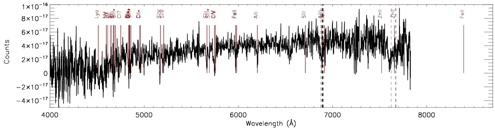 Рис.2. Спектр оптического транзиента GRB090726 с отождествленными линиями, полученный на БТА через полтора часа после всплеска.