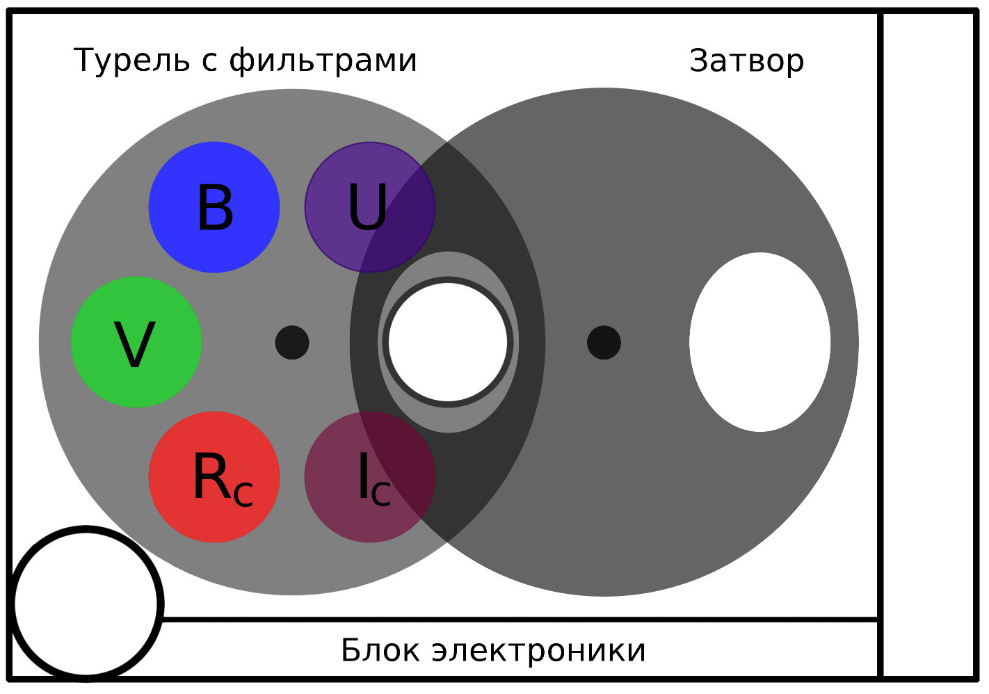 ПЗС-фотометр, устанавливаемый в фокусе Кассегрена (f/13) метрового телескопа Цейсс-1000, предназначен для получения прямых изображений астрономических объектов в полосах U, B, V, Rc, Ic фотометрической системы Джонсона-Казинса, а также в интегральном свете без фильтра (3600-10000 Å).